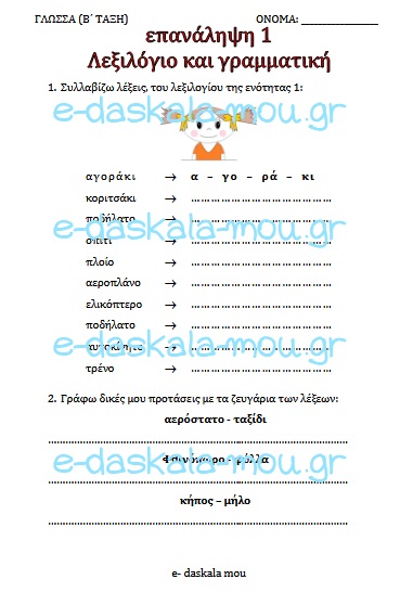 Γλώσσα Β΄ Δημοτικού -ασκήσεις επανάληψης 1ης ενότητας 11Αυγ 20241 Ιούν 2025Προσθήκη σχολίου Γλώσσα Β΄ Δημοτικού -ασκήσεις επανάληψης 1ης ενότητας 3. επανάληψη 1 (λεξιλόγιο και γραμματική)Λήψη