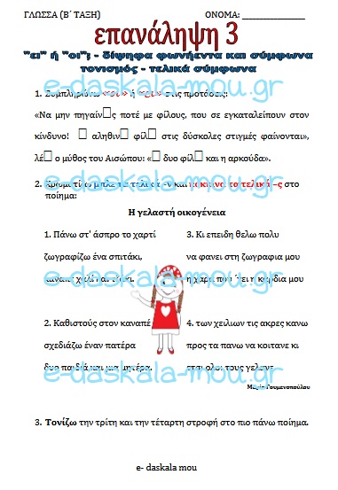 Γλώσσα Β΄ Δημοτικού -ασκήσεις επανάληψης 3ης ενότητας 11Αυγ 20241 Ιούν 2025Προσθήκη σχολίου Γλώσσα Β΄ Δημοτικού -ασκήσεις επανάληψης 3ης ενότητας 12. επανάληψη 3 – ει ή οι; – δίψηφα φωνήεντα και σύμφωνα- τονισμός- τελικά σύμφωναΛήψη