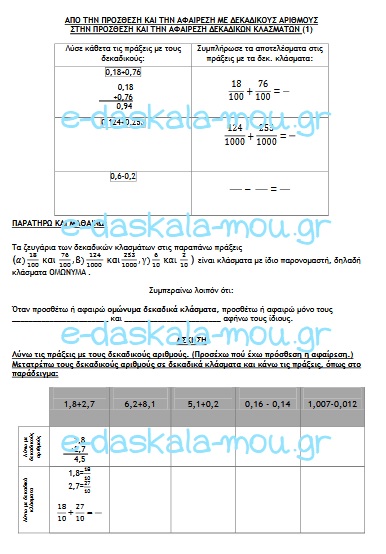 Από την πρόσθεση και την αφαίρεση με δεκαδικούς αριθμούς στην πρόσθεση και την αφαίρεση με ομώνυμα δεκαδικά κλάσματα (1)