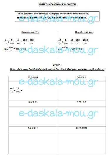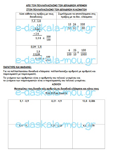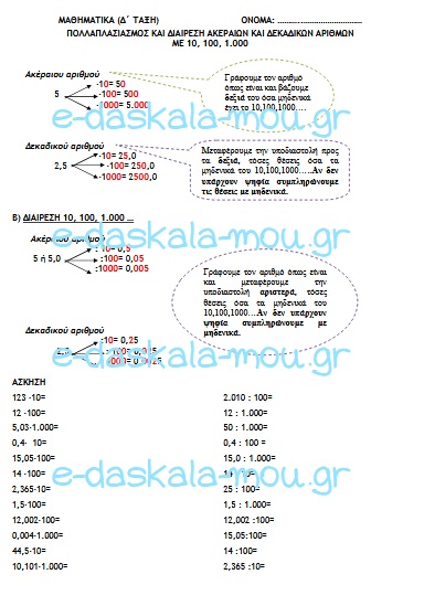 Πολλαπλασιασμός και διαίρεση ακέραιων και δεκαδικών αριθμών με 10, 100, 100