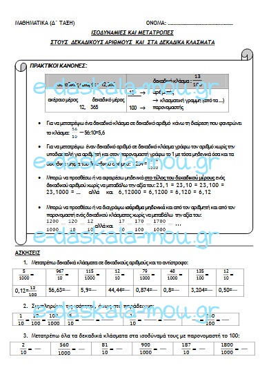 Ισοδυναμίες και μετατροπές στους δεκαδικούς αριθμούς και στα δεκαδικά κλάσματα