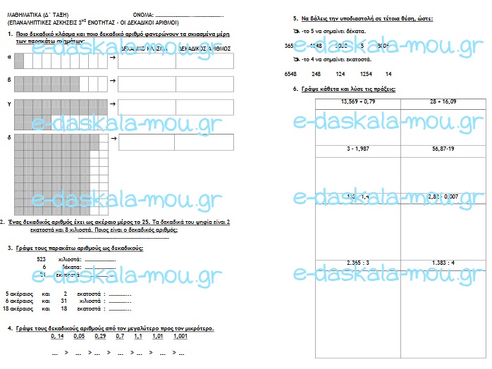 Μαθηματικά Δ΄ Δεκαδικά κλάσματα – Δεκαδικοί Αριθμοί – Πράξεις (13 έντυπα φύλλα εργασίας)