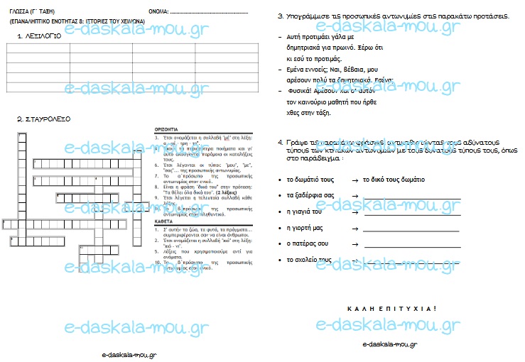 ΓΛΩΣΣΑ Γ΄ ΔΗΜΟΤΙΚΟΥ Ασκήσεις επανάληψης και κριτήριο αξιολόγησης στην ενότητα “Ιστορίες του χειμώνα” – 2 φύλλα εργασίας