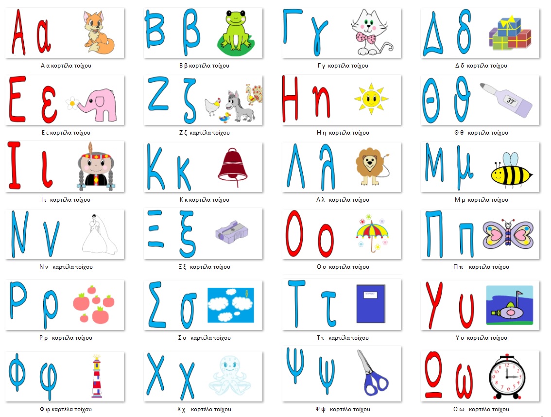 24 αρχεία εικόνας με τα 24 γράμματα. Εκτυπώνονται, πλαστικοποιούνται και αναρτώνται, συνήθως, πάνω από τον πίνακα της Α΄ τάξης