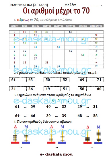 ΜΑΘΗΜΑΤΙΚΑ Α΄ ΔΗΜΟΤΙΚΟΥ – Οι αριθμοί μέχρι το 70